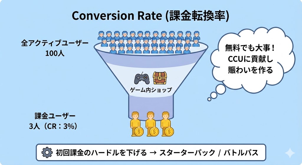 | 解説 | 無料ユーザーが有料ユーザーに転換する割合です。F2Pゲームでは通常1〜5%程度と非常に低く、これが正常です。残りの95〜99%の無料ユーザーは「ゲームの賑わい」としてCCUに貢献し、課金ユーザーの体験を豊かにする重要な存在です。 |